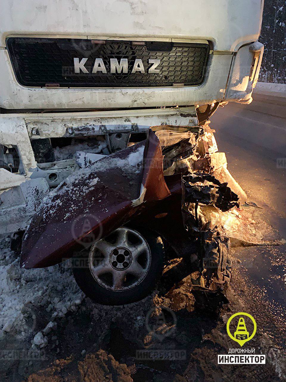 От удара о КАМАЗ седан «КИА Спектра» буквально разорвало на части. Водитель и пассажир легкового автомобиля погибли.