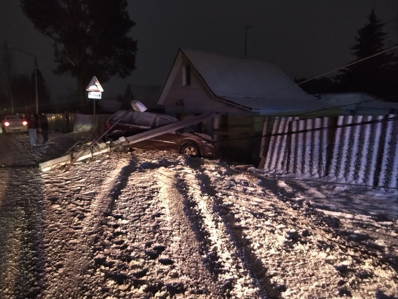 Автомобиль залетел с дороги на частную территорию во Всеволожском районе Ленинградской области.