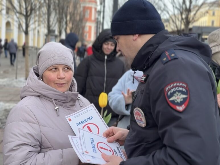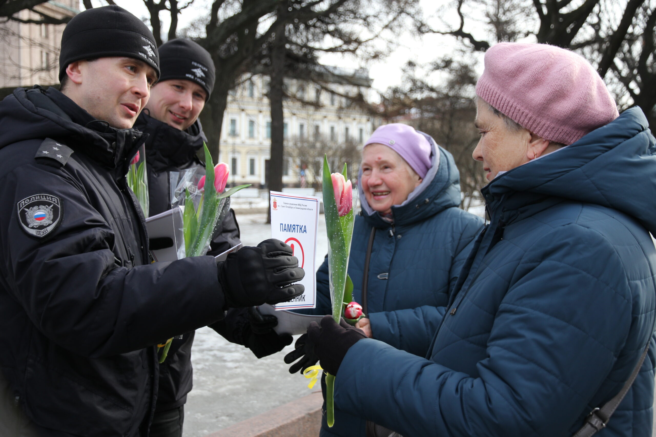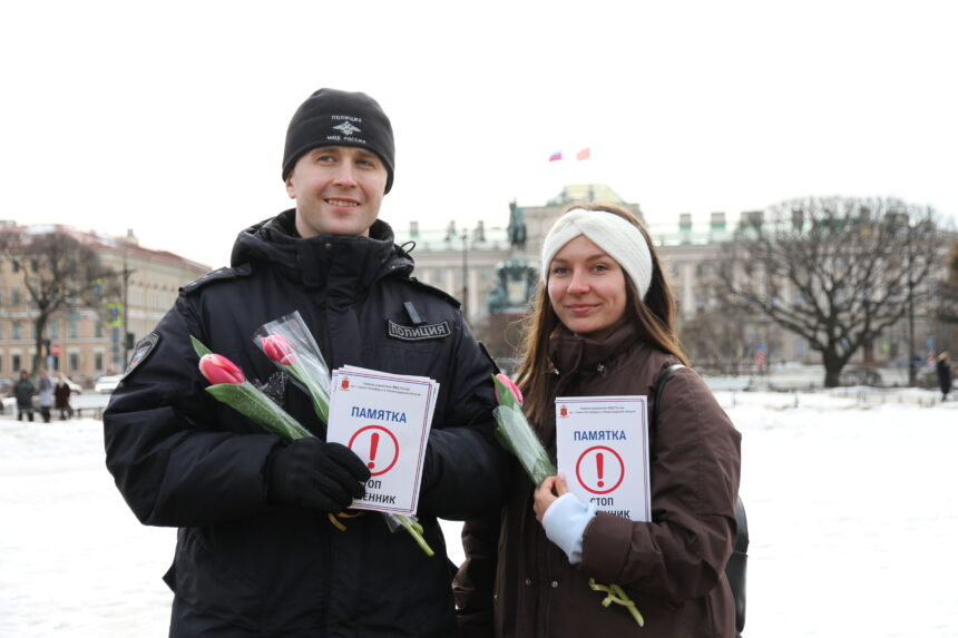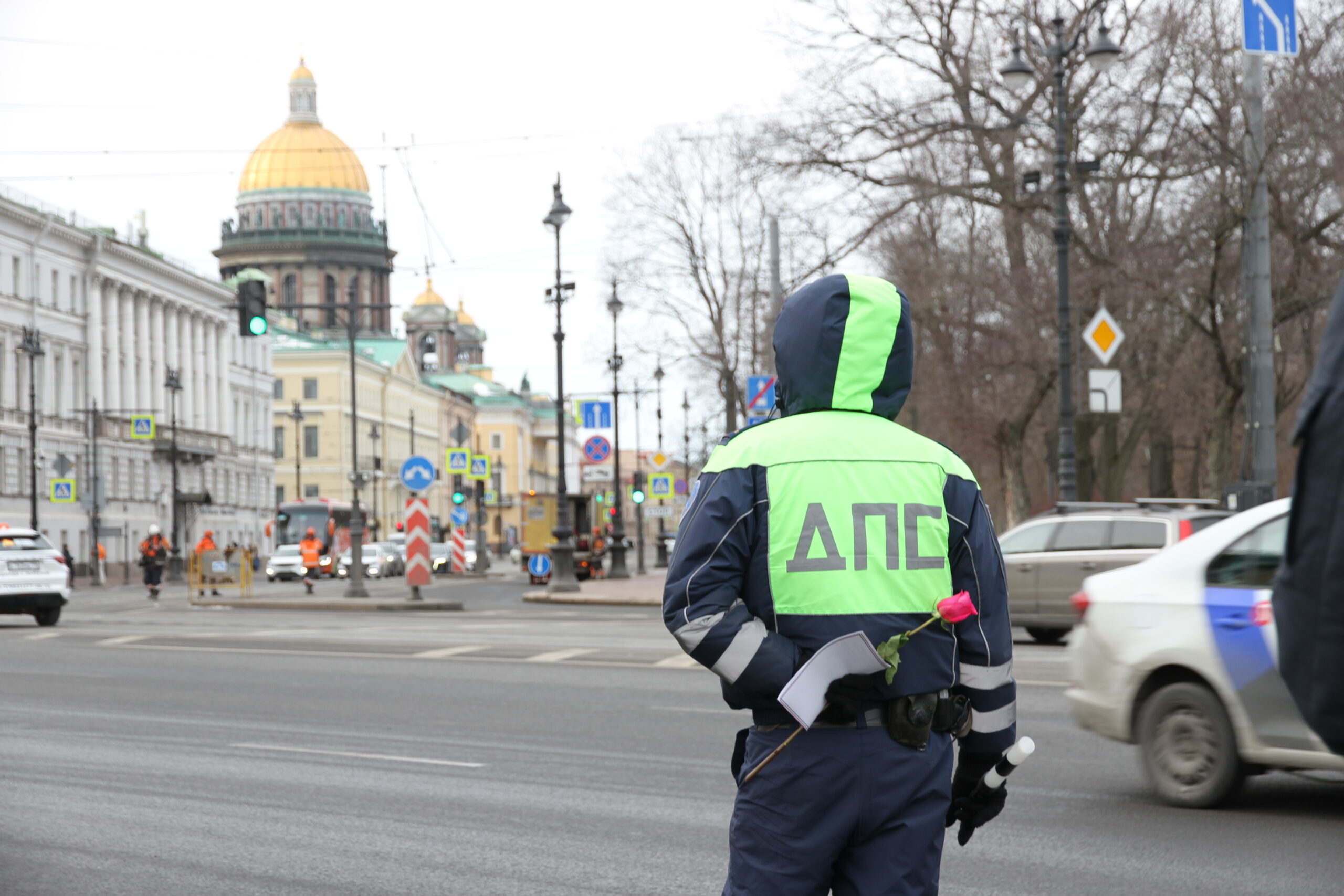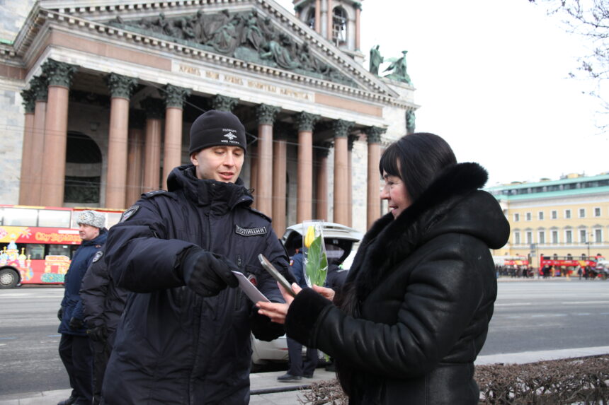 Сотрудники ГАИ и Спецполка полиции 8 марта останавливали в центре Петербурга только дам – чтобы вручить им тюльпаны