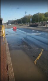 Водители, не ожидая, что яма довольно глубокая, попадали в нее колесами. У промоины сегодня, 24 мая, дорожная служба установила заграждение, однако его сдвинули во время движения. Рабочие сообщили, что из ямы идет вытекание холодной воды и вызвали бригаду "Водоканала".