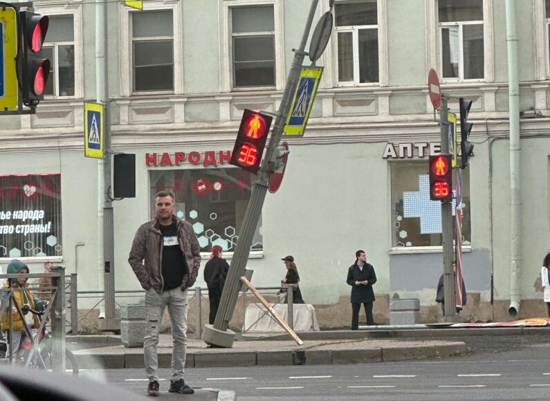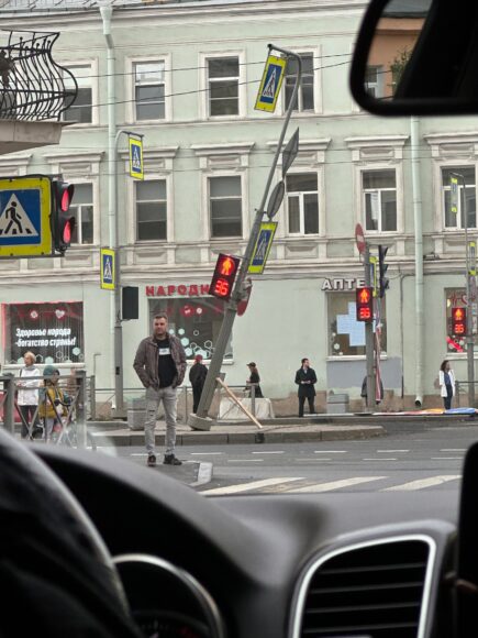 Как минимум на 30 градусов наклонился столб со светофором для пешеходов и дорожными знаками, стоящий у дома №193 на Лиговском проспекте – у перекрестка с Курской улицей.