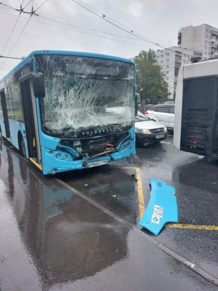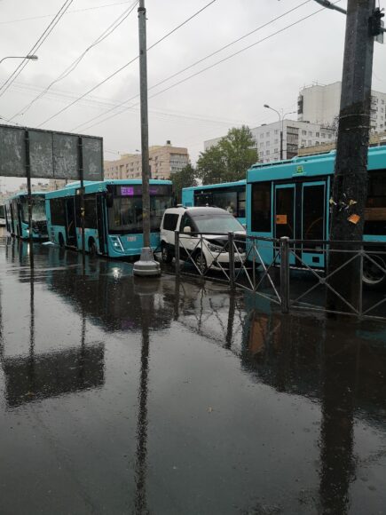 Авария с участием трех лазурных городских автобусов и легковушки произошла утром 28 июля во Фрунзенском районе Петербурга.