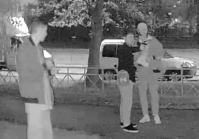 Мимо шли трое парней. Сперва один из них что-то выбросил в урну возле парадной, а затем двое других достали предмет, похожий на пистолет, и принялись стрелять в направлении урны. Позже присоединился третий.