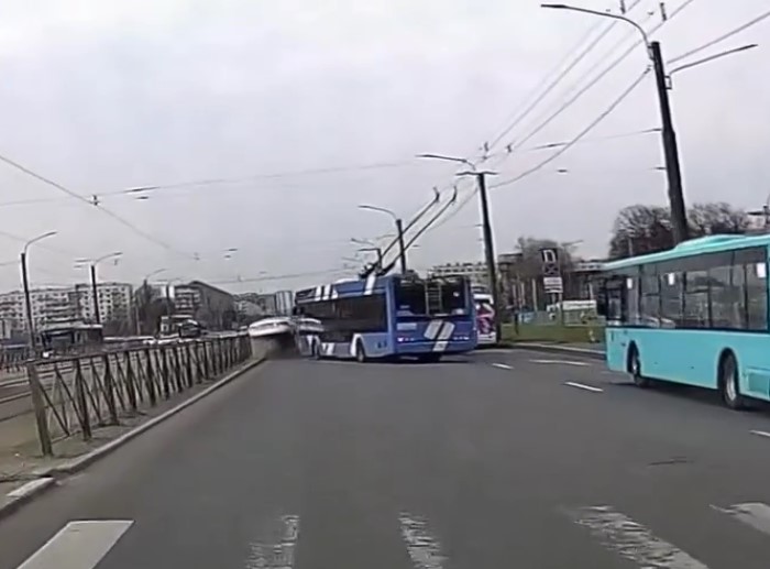 Троллейбус, отъезжая от остановки и направляясь в сторону проспекта Большевиков, перестроился из первого ряда в третий и не пропустил ехавший там попутный автомобиль.