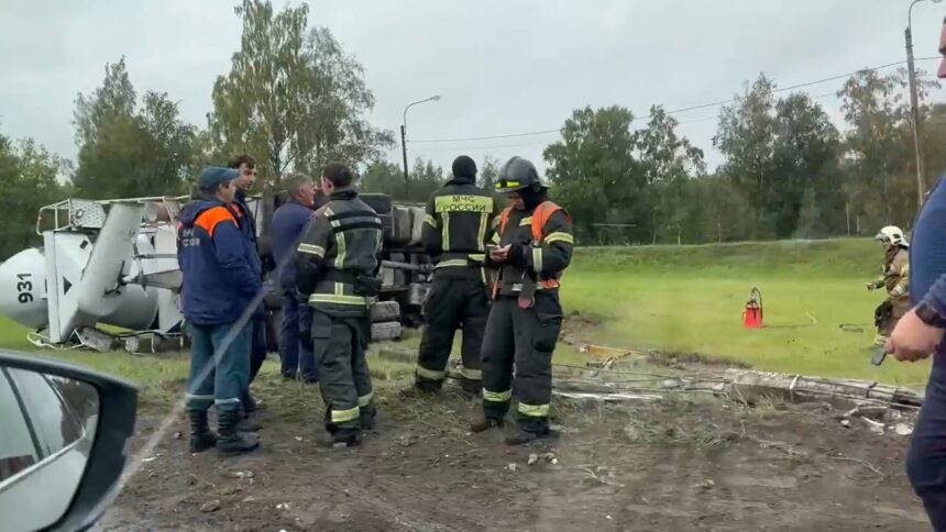 В Курортном районе Санкт-Петербурга опрокинулся автобетоносмеситель. Спецтехника съехала с дороги и упала на бок.