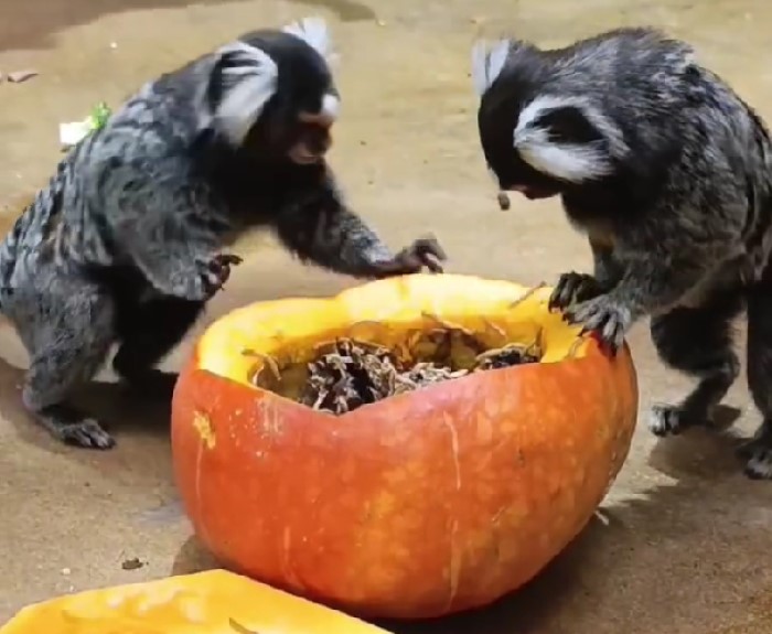 Сотрудники зоопарка решили приготовить обезьянкам особый деликатес: вынув из серединки тыквы мякоть, они наполнили ее ароматными шишками и мучными червями, которые игрунки очень любят.