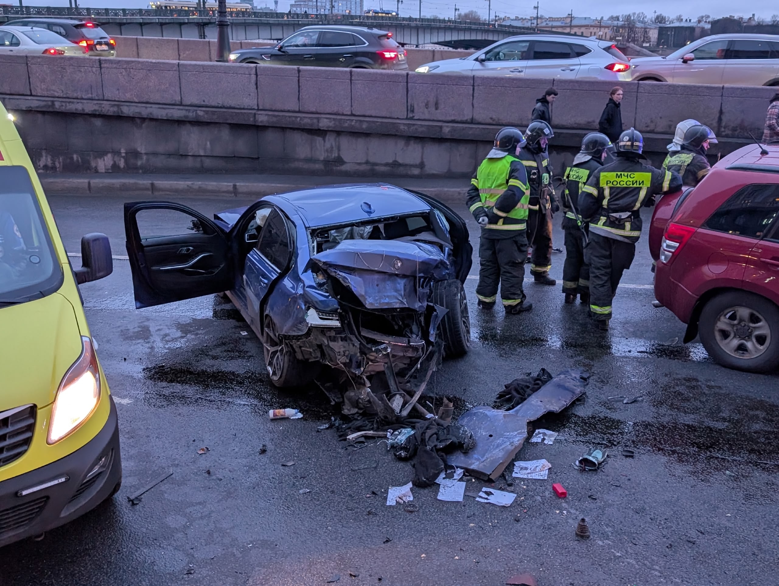 Рассказ и фотографии жутких последствий аварии появились в группе «ДТП-ЧП-СПб» ВКонтакте. В результате пострадали четыре человека. Серьезнее всех – водитель «бэхи», которого госпитализировали в состоянии клинической смерти. Его пассажирке, 23-летней девушке, повезло больше: ее доставили в больницу в состоянии средней степени тяжести.