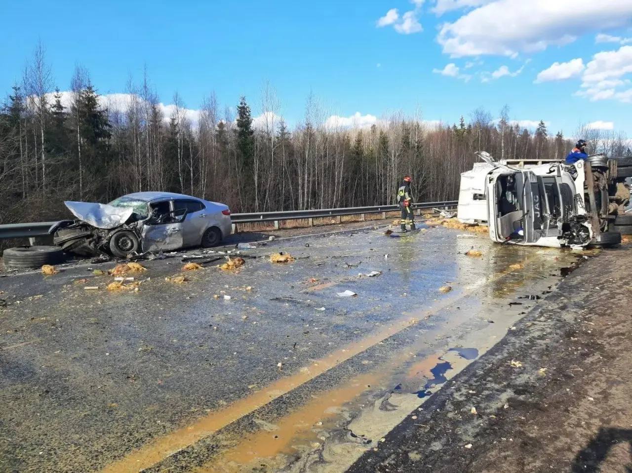 В результате столкновения грузовой автомобиль опрокинулся на бок, а на проезжей части оказалось то, что он вез. Кабина бензовоза «сложилась», заднюю часть авто искорежило. Легковушку выбросило в отбойник.