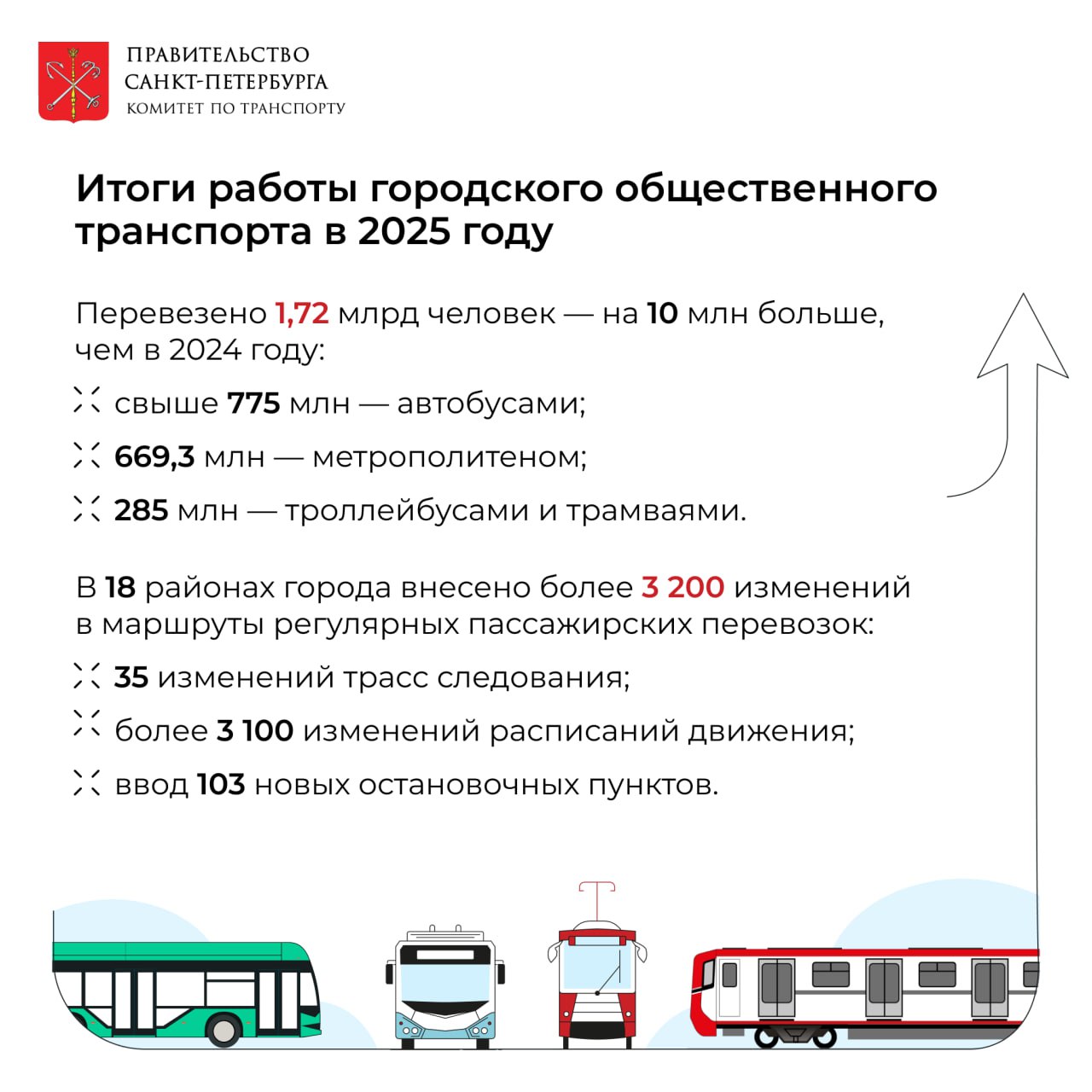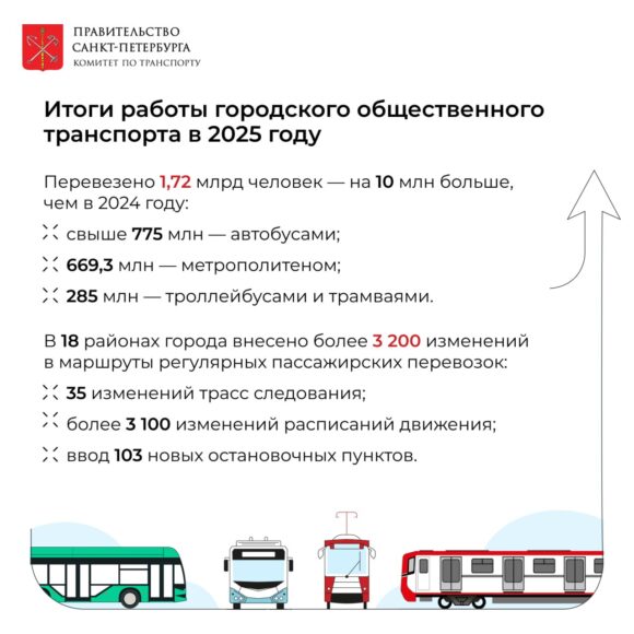 По итогам 2025-го года петербуржцы совершили более 1,72 млрд поездок на общественном транспорте – пассажиропоток по сравнению с позапрошлым годом вырос на 10 млн человек, в своем телеграм-канале рассказал вице-губернатор Петербурга Кирилл Поляков.