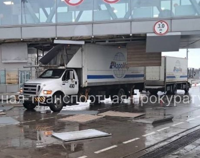 Двигаясь по территории аэропорта, грузовик не прошел под конструкцией, являющейся частью терминала воздушной гавани. Установленный на ней дорожный знак Ограничение высоты», как видно, не был замечен водителем.