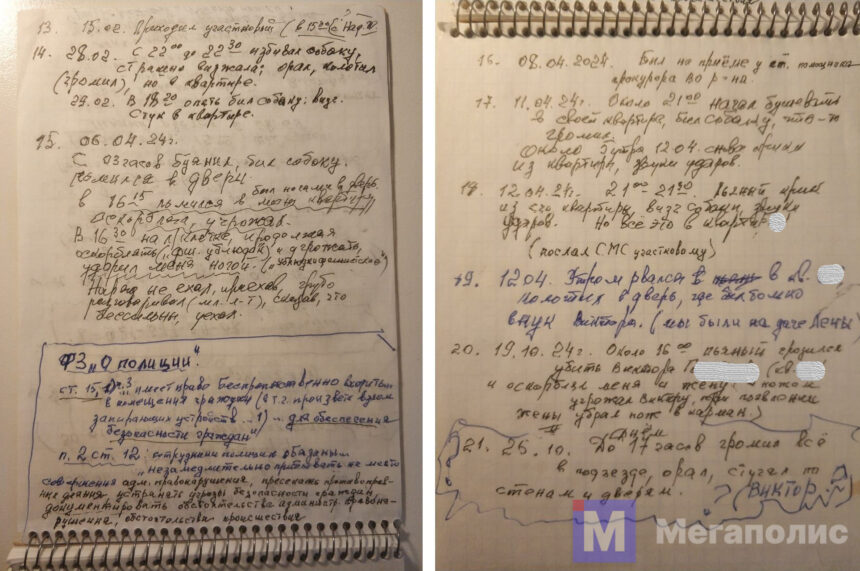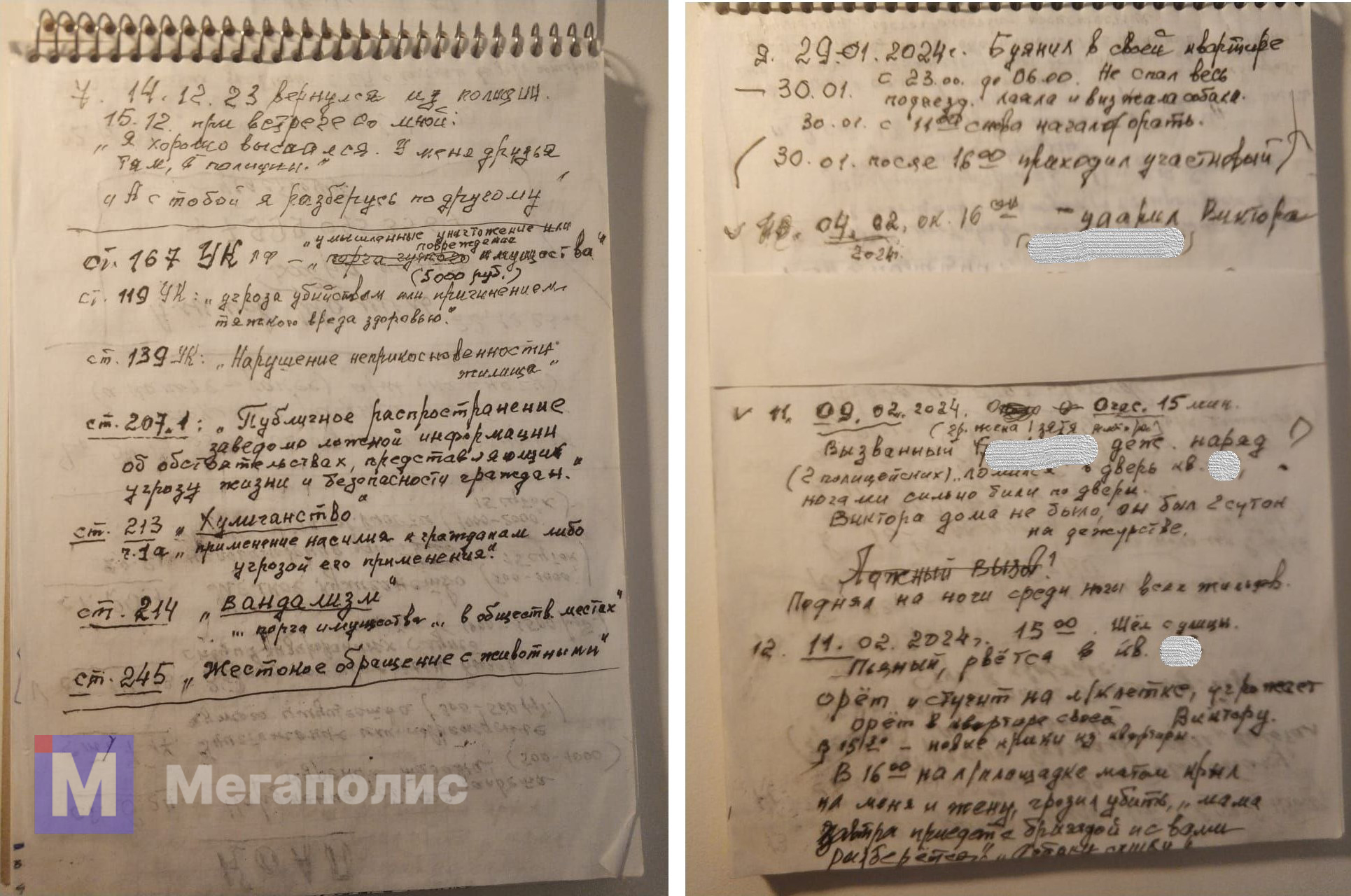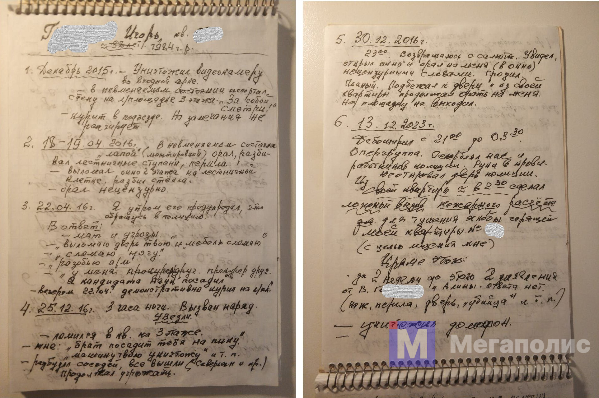 Избитый пенсионер десять лет, начиная с 2015 года, вел дневник, куда записывал наиболее громкие происшествия с Игорем. В записях фигурирует множество угроз, которые он и другие соседи получали в ответ на любое замечание. Мужчина грозился сломать ему ногу, испортить машину, выломать дверь. «У меня прокурор – друг», «Я кандидата наук посадил!» - хвастал он перед пожилым учителем.