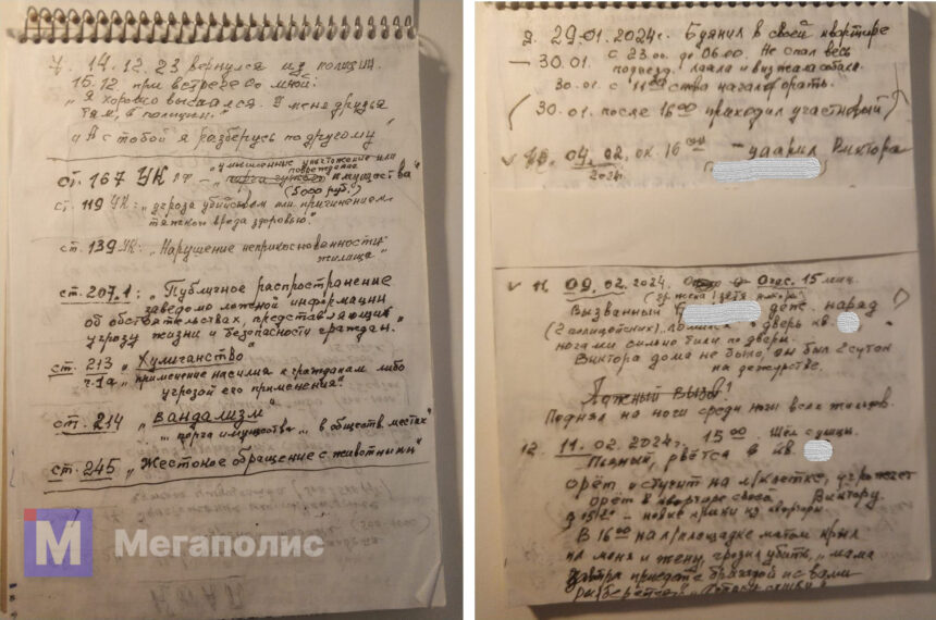 Владимир Валентинович на отдельной страничке своего дневника выписал в столбик несколько уголовных статей, которые, с его точки зрения, вполне уместно было бы вменить агрессору: «Умышленное уничтожение или повреждение имущества» (167-я статья УК), «Нарушение неприкосновенности жилища» (139-я), «Хулиганство» (213-я), «Вандализм» (214-я), «Угроза убийством или причинением тяжкого вреда здоровью» (119-я), «Публичное распространение заведомо ложной информации об обстоятельствах, представляющих угрозу жизни и безопасности граждан» (статья 207.1), «Жестокое обращение с животными» (245-я).