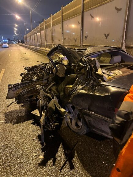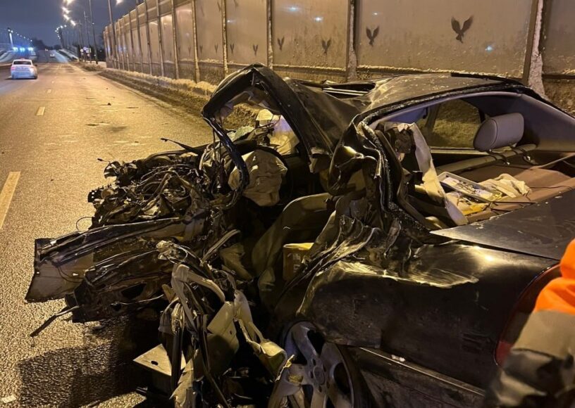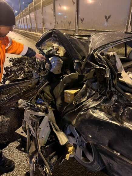 По данным очевидцев, поделившихся фото и видео с места ДТП, от «Мерседеса», налетевшего на снегоуборщик, осталась лишь груда железа. Сидевший за рулем молодой человек чудом выжил. Скорая помощь забрала его в больницу с переломом ноги.