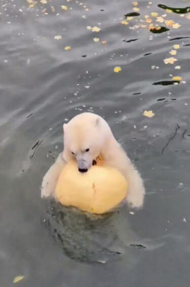 «Все чисто! Никаких признаков лишних добавок!», – убедились в зоопарке и тыква, наконец, досталась белоснежной красавице – плод пульнули прямо в бассейн.