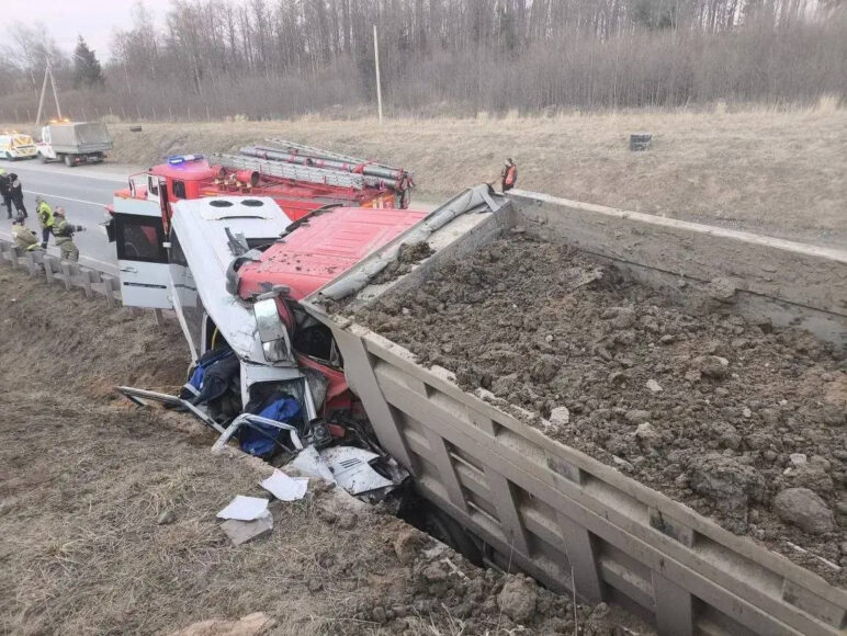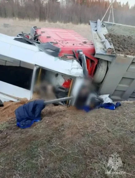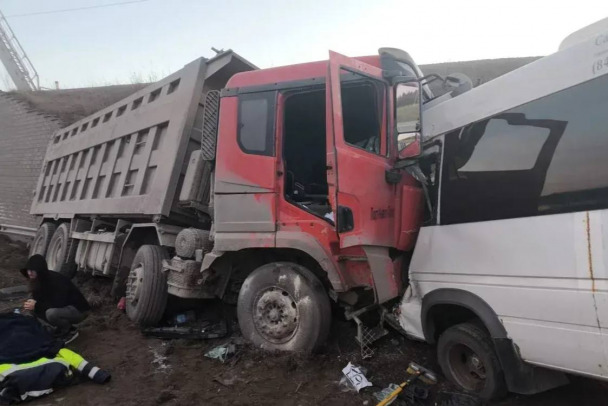 На кадрах с места аварии, опубликованных в сети, хорошо видно врезавшийся в микроавтобус самосвал, причем, оба тяжеловеса улетели в отбойник. Упомянутые жертвы ДТП погибли на месте, а водителя грузовика зажало в искореженной кабине.