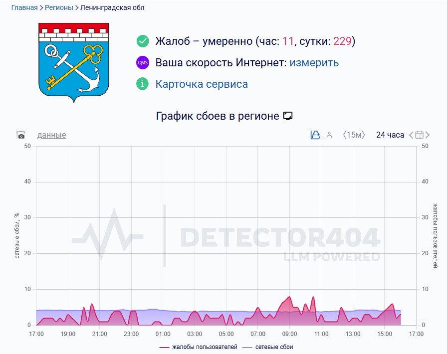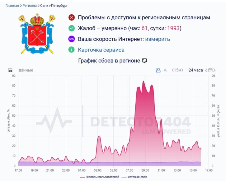 По данным сайта DownDetector, отслеживающим сбои мобильной связи и интернета, пик жалоб в Петербурге наблюдался в районе 9 часов утра, однако после этого работа сети в норму до сих пор так и не пришла. При этом в области, судя по инфографике, интернет почти не обрывался.