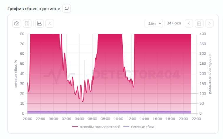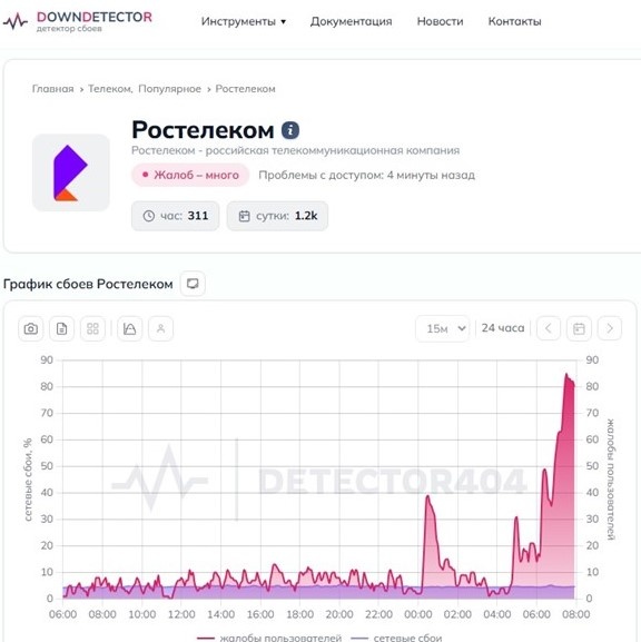 Пользователи сообщают, что недоступны многие мессенджеры и сайты. Из работающих ресурсов остаются только платформа «ВКонтакте» и некоторые базовые страницы. Наибольшее количество обращений поступило в отношении провайдера «Ростелеком». За сутки зарегистрировано более тысячи жалоб.