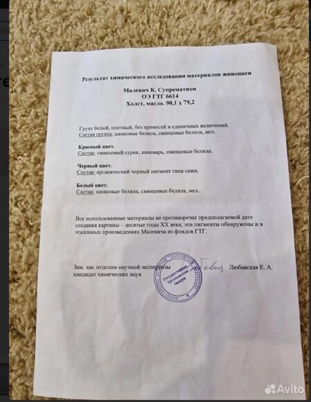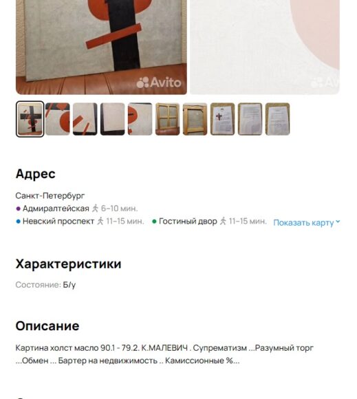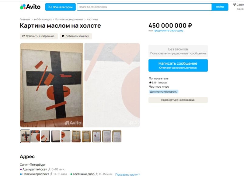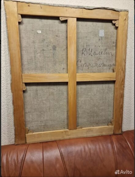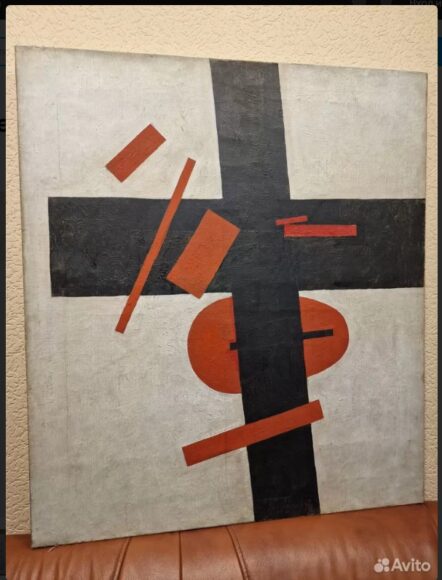 Картину "маслом на холсте" выставил неизвестный петербуржец на продажу на сервисе "Авито" и просит за неё 450 миллионов рублей. Продавец утверждает, что полотно "Супрематизм" написано советским художникрм-авангардистом Казимиром Малевичем.