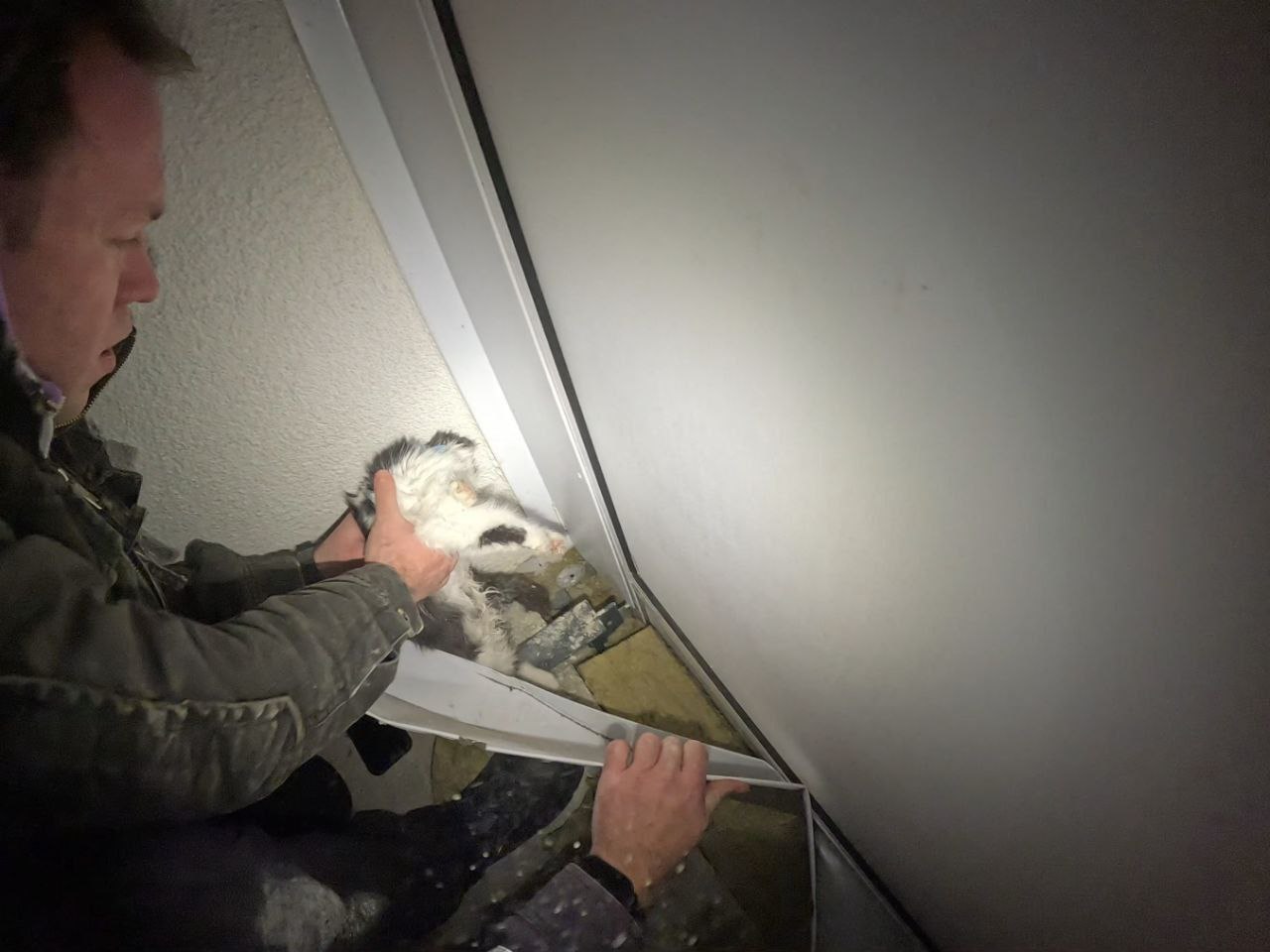 Пушистое создание пробралось в дырку в обшивке и провалилось на три этажа вниз. Прибывшие по вызову спасатели спустили в отверстие камеру и разглядели, что пленница настолько обессилела, что практически не шевелилась, только изредка жалобное мяукая. Оперативно вытащить животинку не удавалось из-за острой металлической кромки, плюс к тому, пространство западни резко сужалось, рассказал детали операции телеграм-канал Службы спасения животных СПб и ЛО и ПСО «ЭКСТРЕМУМ» «Кошкиспас».