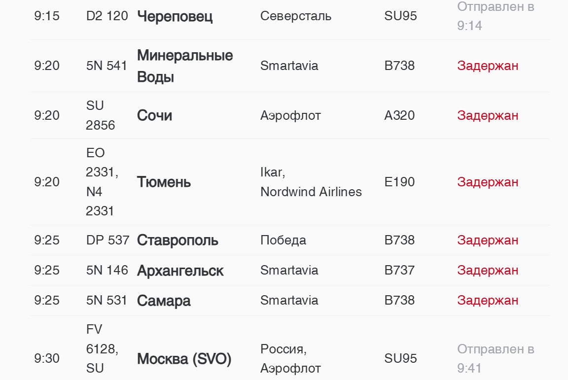 О задержках сигнализирует онлайн-табло на сайте аэропорта. С полуночи на нем можно найти около 40 бортов, которые должны были улететь, но до сих пор не отправлены.