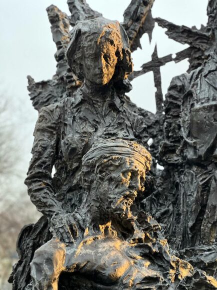 «Памятник изображает двух медиков и лежащего раненого бойца на фоне полуразрушенного окна. Второй фасад представляет собой иносказательный военный натюрморт из полуразрушенного окна, стёкл, обожженных штор», - описал монумент Пиотровский.