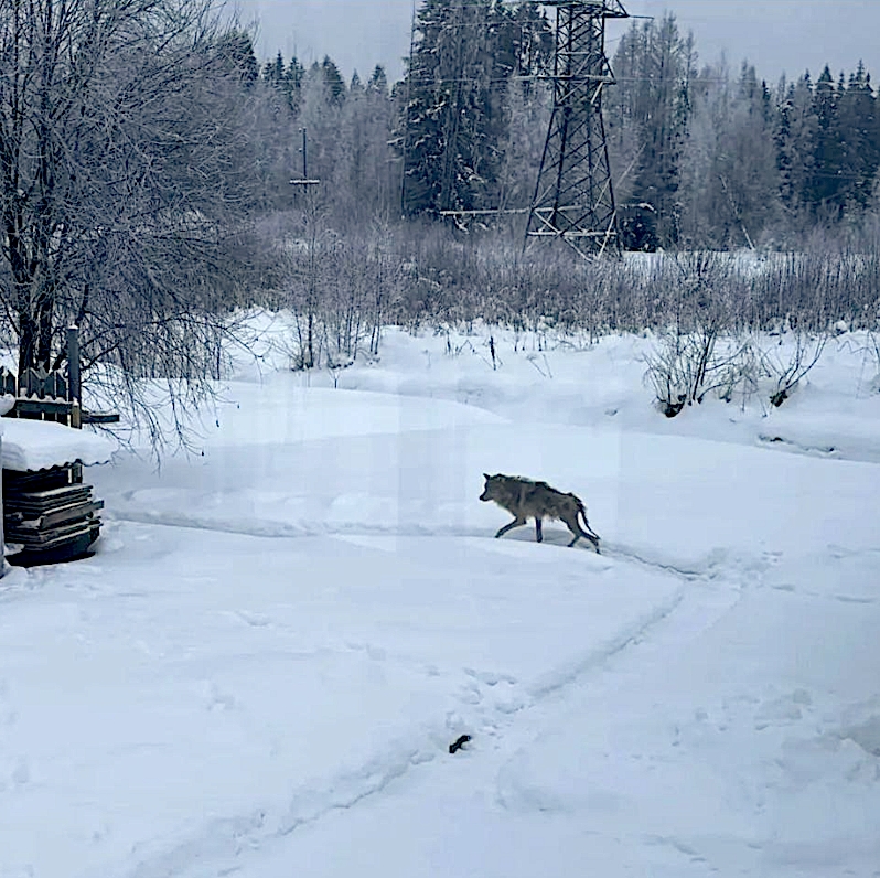 Волк зачастил в дом на окраине Тихвина, где одна добрая женщина организовала что-то вроде пункта питания и обогрева для бездомных собак.