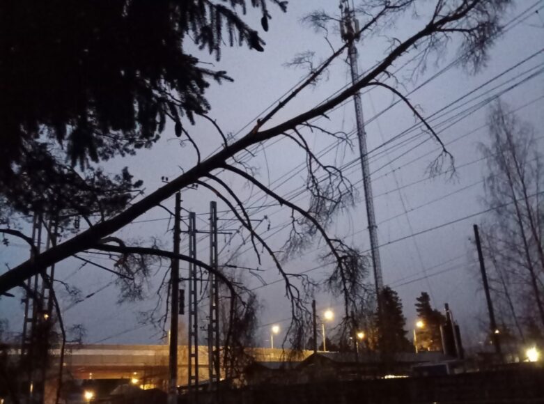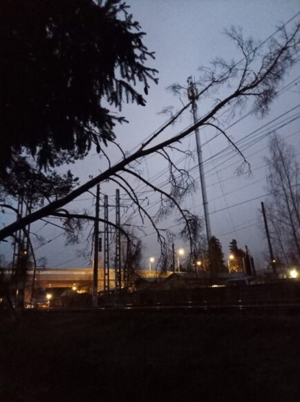 Во всеволожском микрорайоне Мельничный Ручей ветер минувшей ночью повалил дерево на контактные провода возле железнодорожных путей, что стало причиной задержки нескольких электричек.