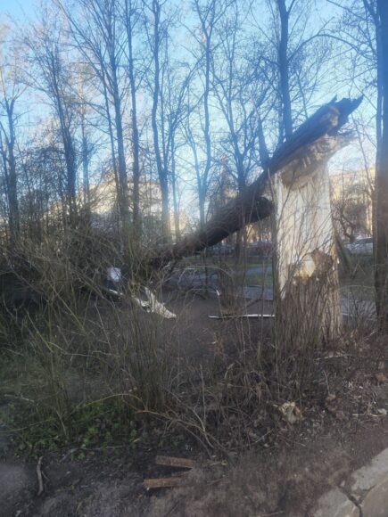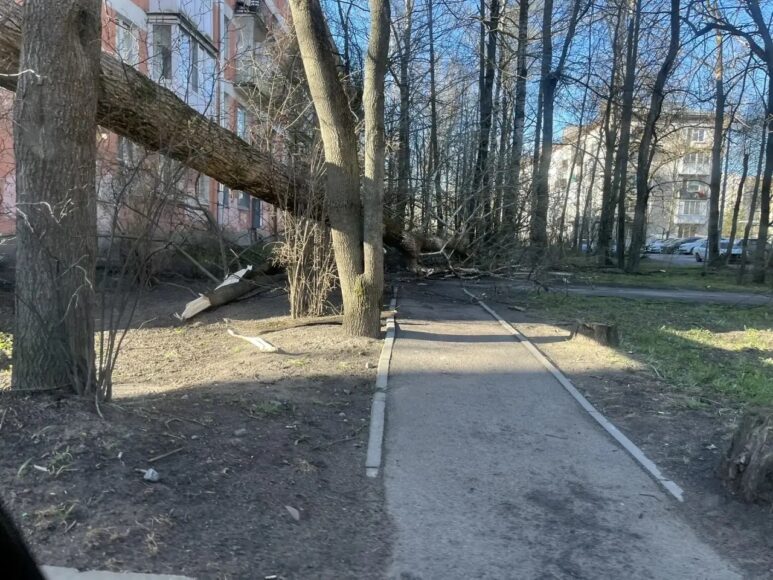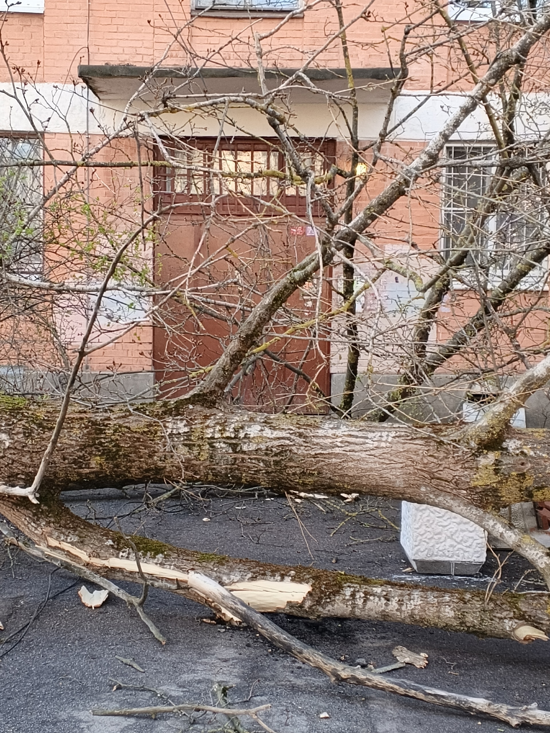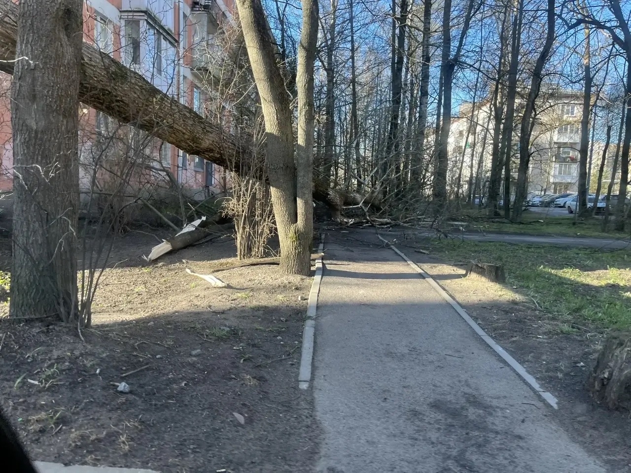 В Красном Селе у дома №32 на улице Освобождения ветер повалил еще одно дерево. Рухнувший ствол перегородил вход в парадную, но, к счастью, не навредил ни людям, ни машинам.