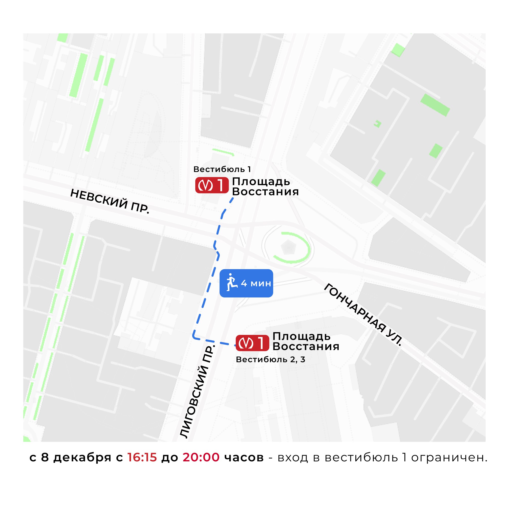 Начиная с понедельника 8 декабря, пассажирам придется терпеть неудобства при входе в вестибюль №1 станции «Площадь Восстания», который находится на одноименной площади. Его будут ограничивать по вечерам, с 16:15 до 20:00. Причина – капитальный ремонт эскалаторов.