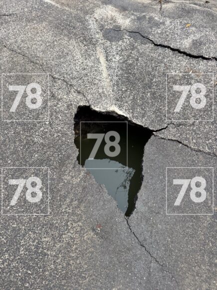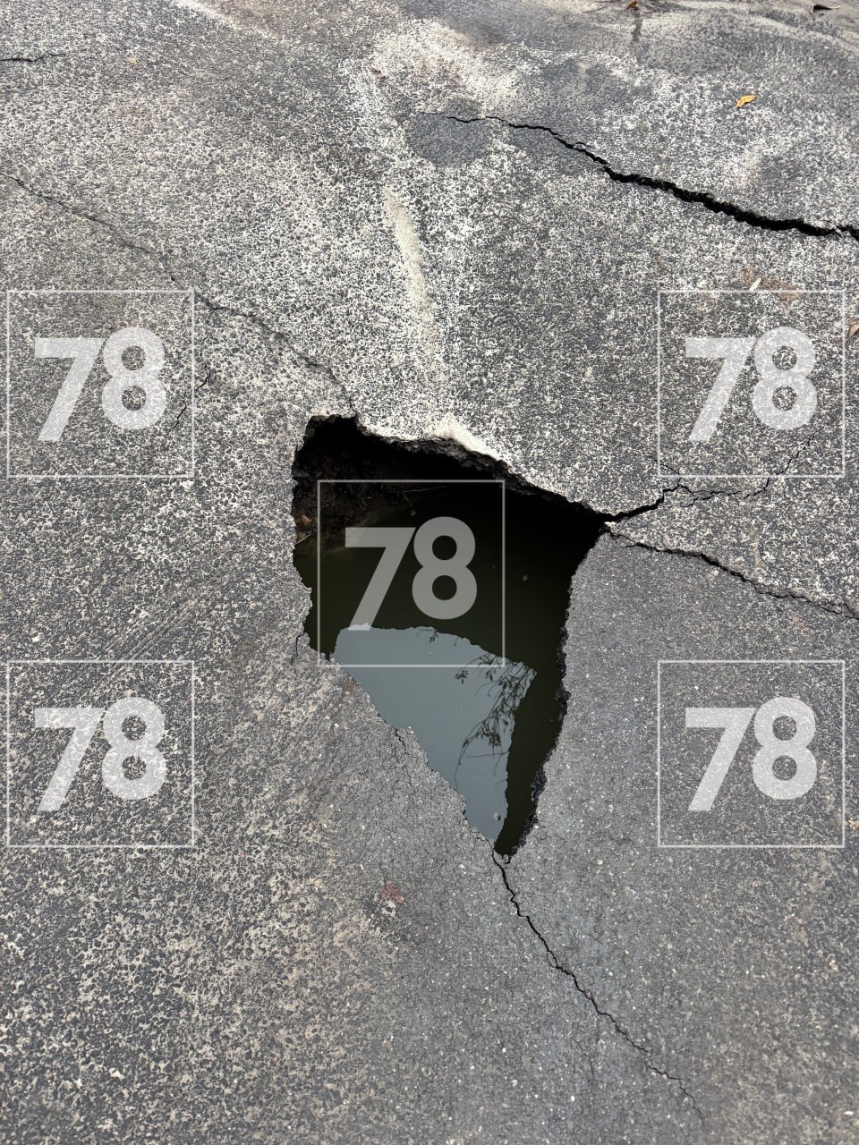 Зрители 78-го телеканала сфотографировали дыру, которая образовалась в асфальте. Они утверждают, что затопило не только дорогу, но и подвалы трех домов. В «Водоканале» это отрицают.