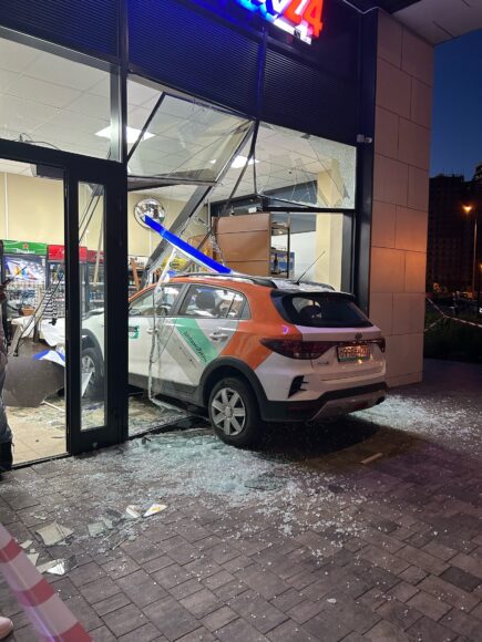В Красносельском районе легковой автомобиль каршерингового сервиса въехал в круглосуточный паб-магазин. Водитель "Делимобиля" умудрился филигранно проехать между колоннами дома в этом месте и угодить прямо в огромную витрину.