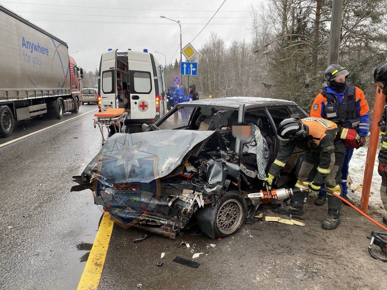 В салоне отечественного автомобиля оказался зажатым водитель. Мужчина получил травмы. Прибывшие на место происшествия члены поисково-спасательного отряда из Тосно вытащили пострадавшего из машины и передали бригаде скорой помощи.