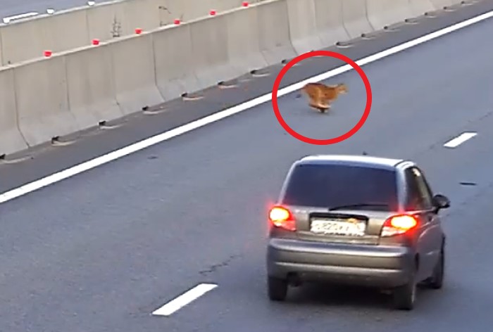 Пушистая красотка выбежала из леса прямо за дорожным знаком, предупреждающим о возможном появлении диких животных. Двоим водителям пришлось резко сбросить скорость, чтобы ее не сбить.