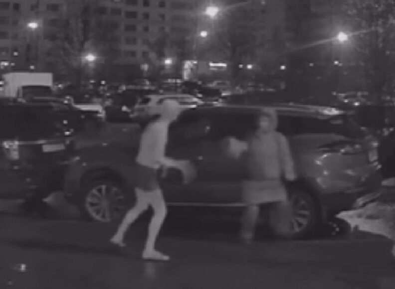 На кадрах видео вышедшую из парадной даму атакует молодой человек, на котором из одежды есть только трусы да шлепанцы. По виду он напоминает наркомана, употребившего синтетическое вещество, которое в народе называют «соль».