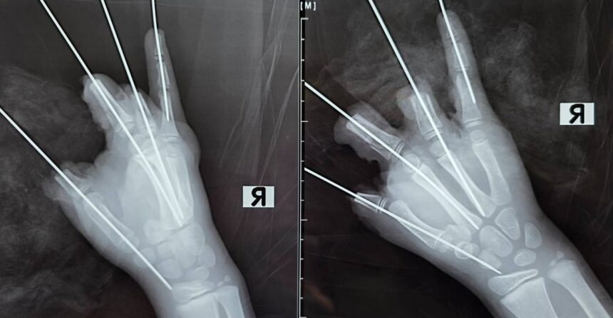В результате взрыва школьнику оторвало четыре пальца на правой руке, с большого по безымянный. Мизинец уцелел, хотя был сильно поврежден. Кроме того, врачи диагностировали у юного пациента открытый перелом и вывих пястной кости, размозжение и множественные дефекты мягких тканей кисти.