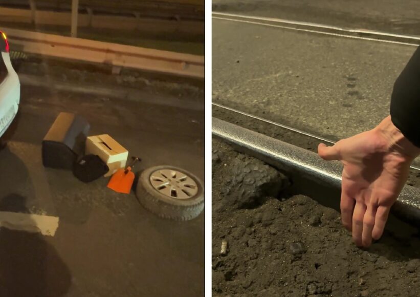 Другой пострадавший от ямы снял на видео, как она выглядит. Углубление высотой примерно 15 сантиметров «ловит» автомобили в момент, когда они проезжают через рельсы.