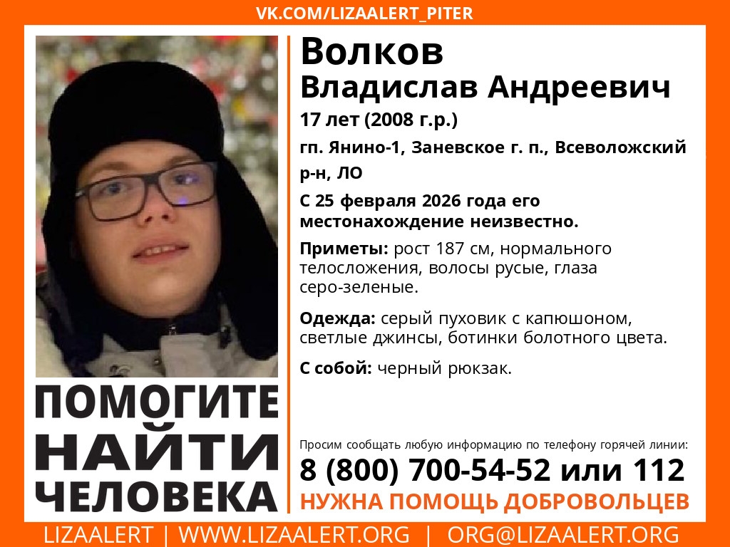 Напомним, 17-летний Владислав Волков 25 февраля ушел из дома в поселке Янино-1 и пропал. Его поисками, помимо полиции и следственных органов, занимаются добровольческие поисково-спасательные отряды «ЛизаАлерт» и «Северо-Запад».