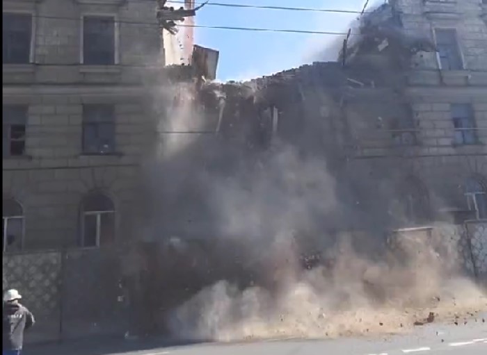 Сегодня во время работ огромный кусок стены упал на дорогу. Очевидец записал этот момент, начиная с 0:58 присланной группе «ДТП-ЧП-СПб» ВКонтакте видеозаписи.