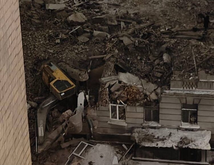 Экскаватор упал вечером 10 января, когда заканчивал крушить одну из стен здания. Судя по кадрам, снятым местными жителями, водитель сумел выбраться из кабины. А, судя по тому, что скорая помощь на место происшествия не приезжала, этот человек не пострадал.