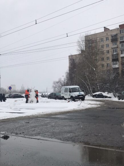 Снеговик ростом выше среднего появился днем 1 апреля в Невском районе Петербурга на левом берегу Невы.