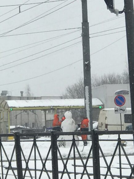 Снеговик порадовал горожан в совсем не весенний первоапрельский день и поднял настроение подписчикам группы «ДТП-ЧП-СПб» ВКонтакте, где проходивший мимо человек поделился снимками. Там его назвали стрелочником.