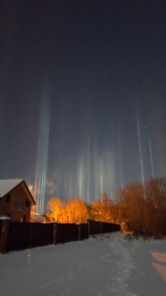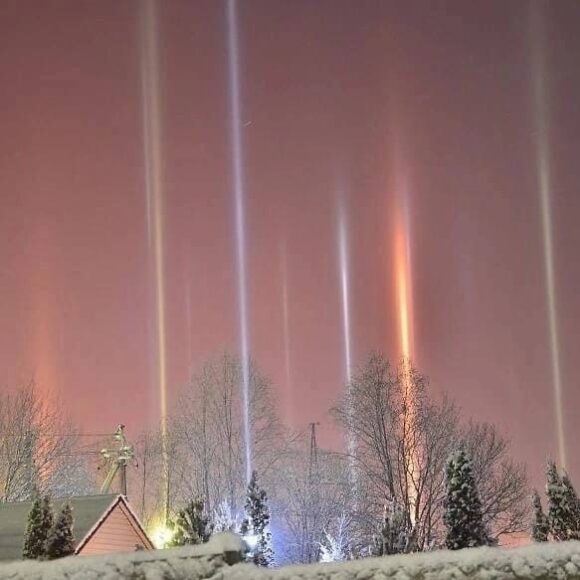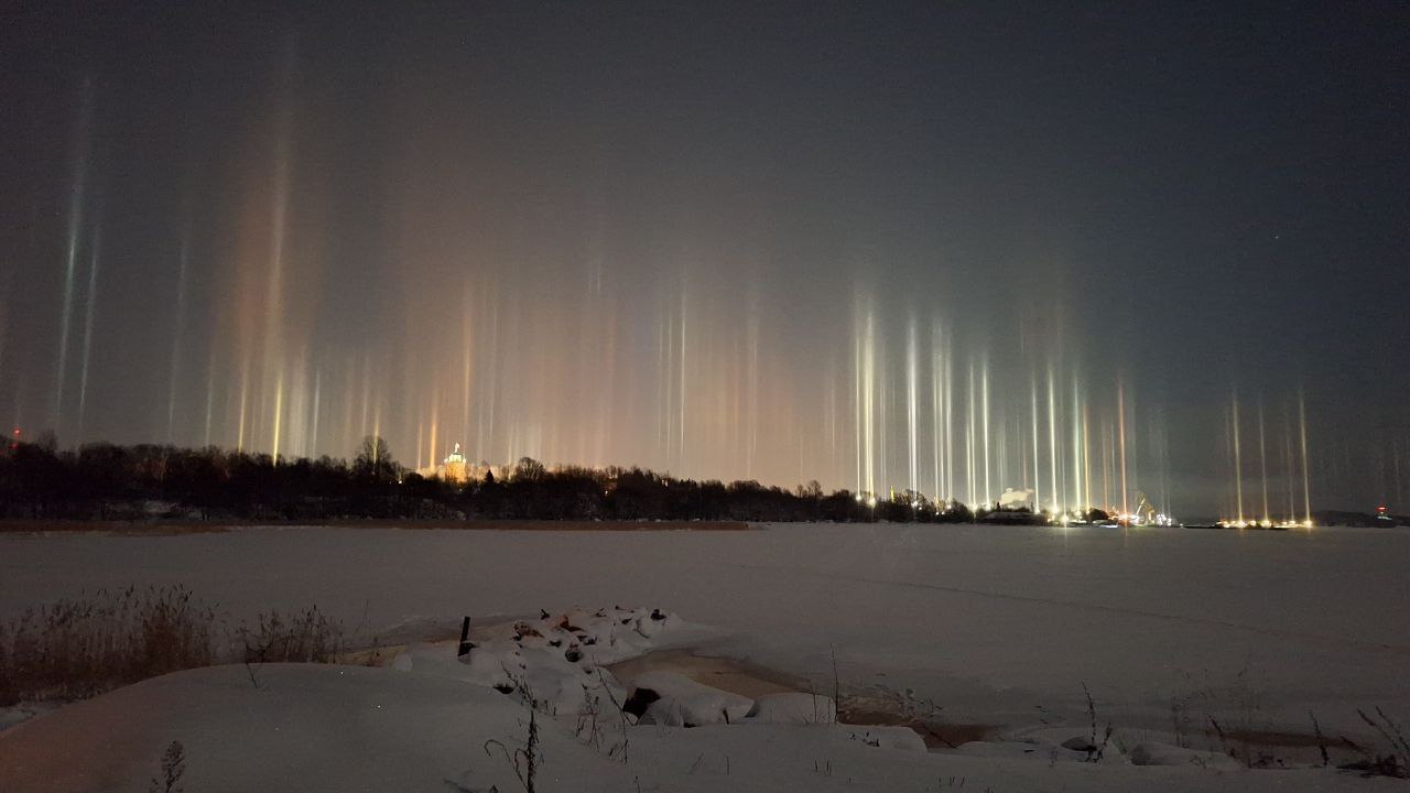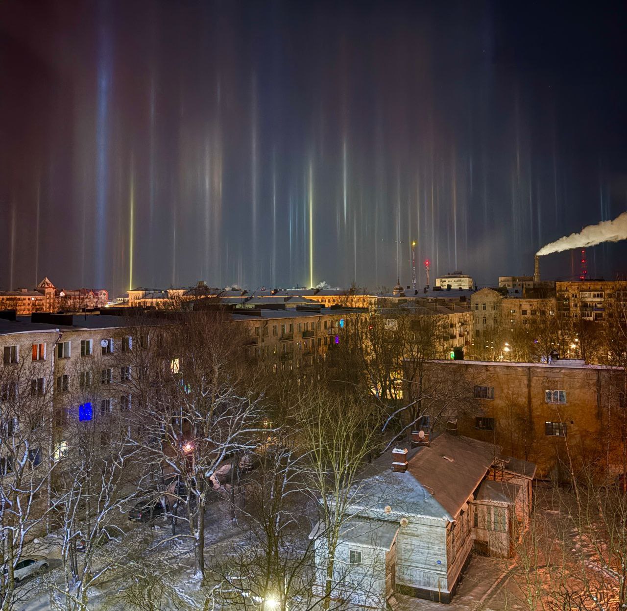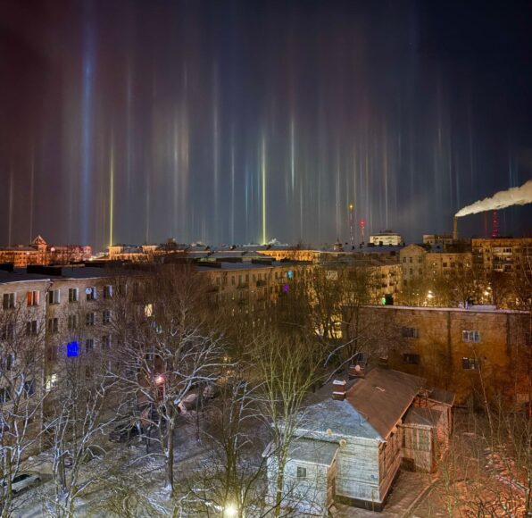 Оказалось, что в небе над районом возникло оптическое явление, называемое «световым лесом»: вертикальные разноцветные колонны света, которые образуются при отражении огней фонарей от парящих в воздухе ледяных кристаллов. Это явление возникает при сильном морозе или резком понижении температуры. Из-за внешней схожести его часто ошибочно принимают за северное сияние, которое тоже регулярно радует жителей не только Ленобласти, но и Петербурга.