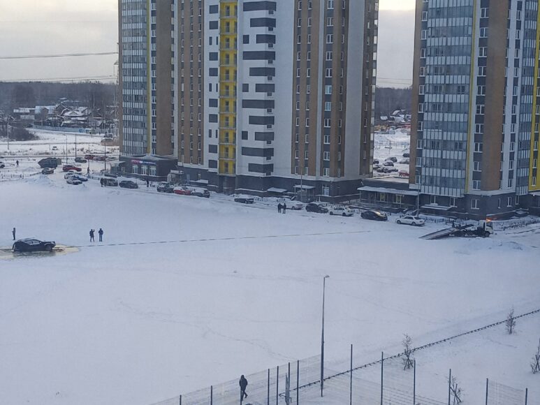 Водитель выбрался из машины и пошел за подмогой. Жители близлежащих домов наблюдали, как к котловану подъехал эвакуатор, к нему тросами прицепили ""Мерседес", а потом машину вытащили из проруби.
