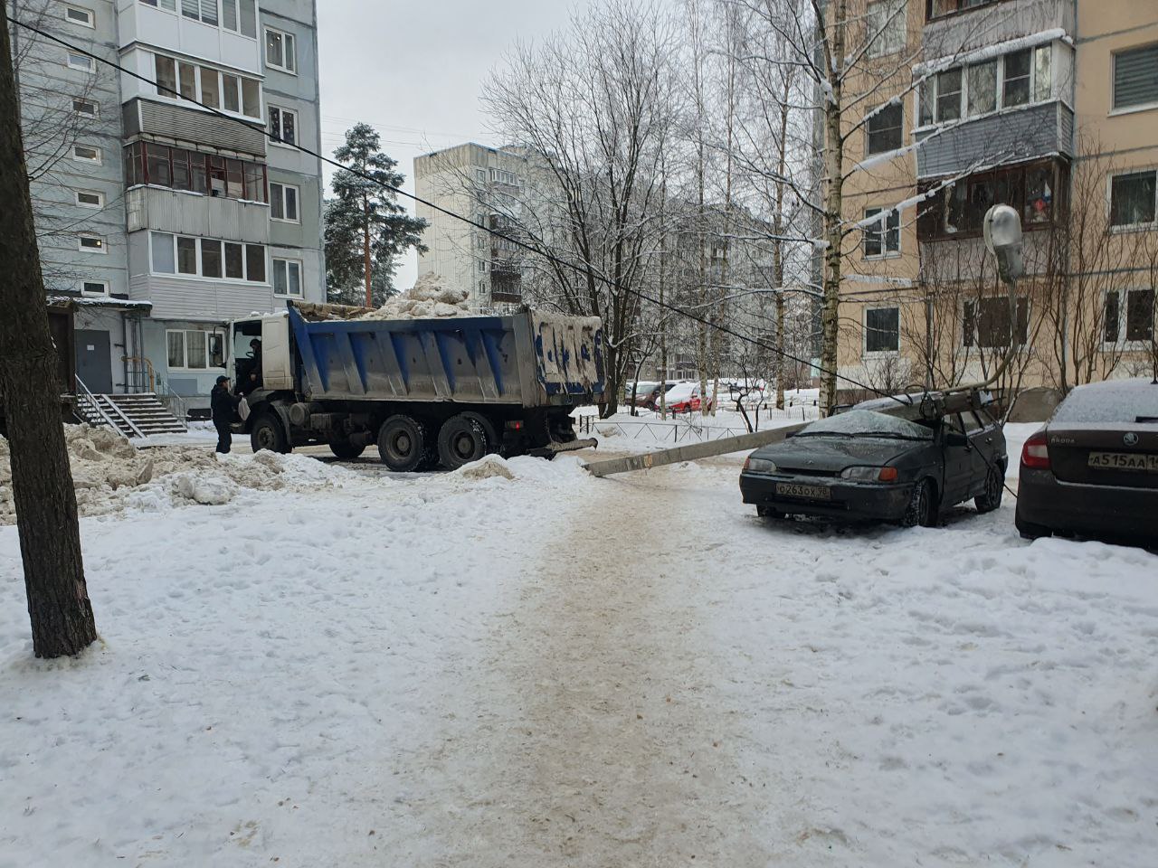 ДТП произошло во время уборки снега во дворе дома №8к2 на Центральной улице города Сертолово. Местная жительница наблюдала из окна, как работает техника: трактор сгребал снег, лежащий в проезде, и грузил его в кузов самосвала.